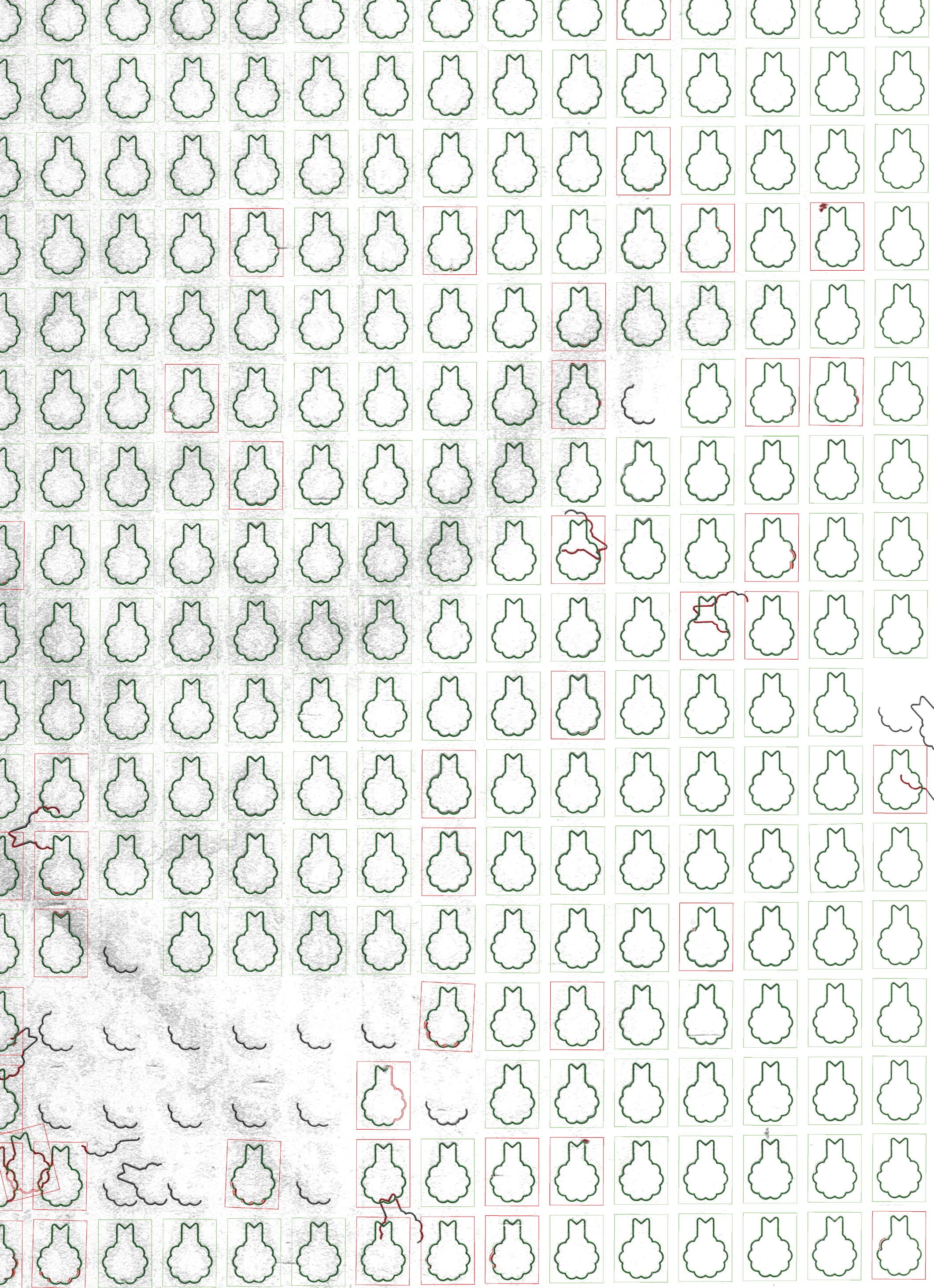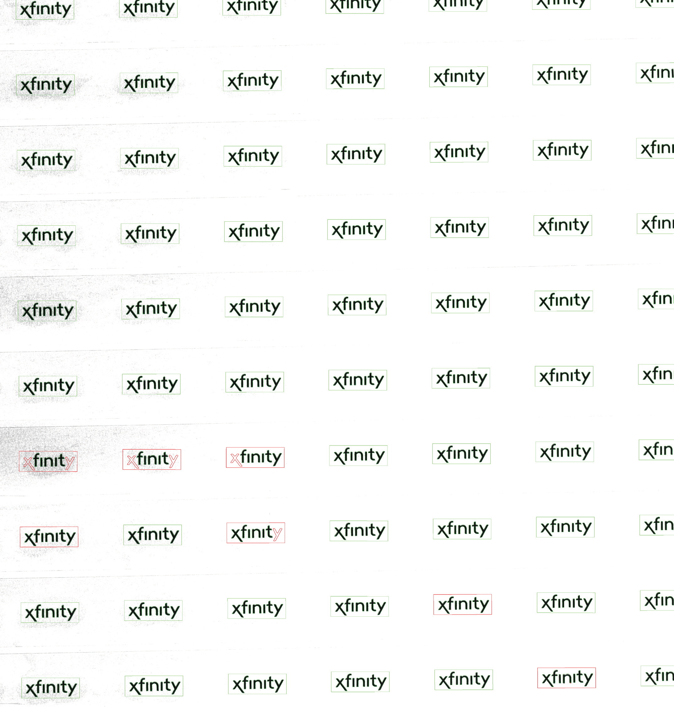 很多消費產品上會釘或者貼上品牌logo,這些logo標識一般都是沖壓成型后再做表面處理,標識標牌 小,數量多,而且有些還會歪、缺、短線等等不良,傳統的人工檢測很難把小的標識缺陷檢測出來, 通過視覺就可以快速識別出不良。效率翻倍,檢測準確。 例如左圖的產品,在一張380*420mm的貼紙上,最少貼了100多個一樣的標牌,還有小一些的標牌 貼了幾百個,人工去檢驗一張的時間要3-4分鐘,使用視覺只需要4-5秒即可檢測完成